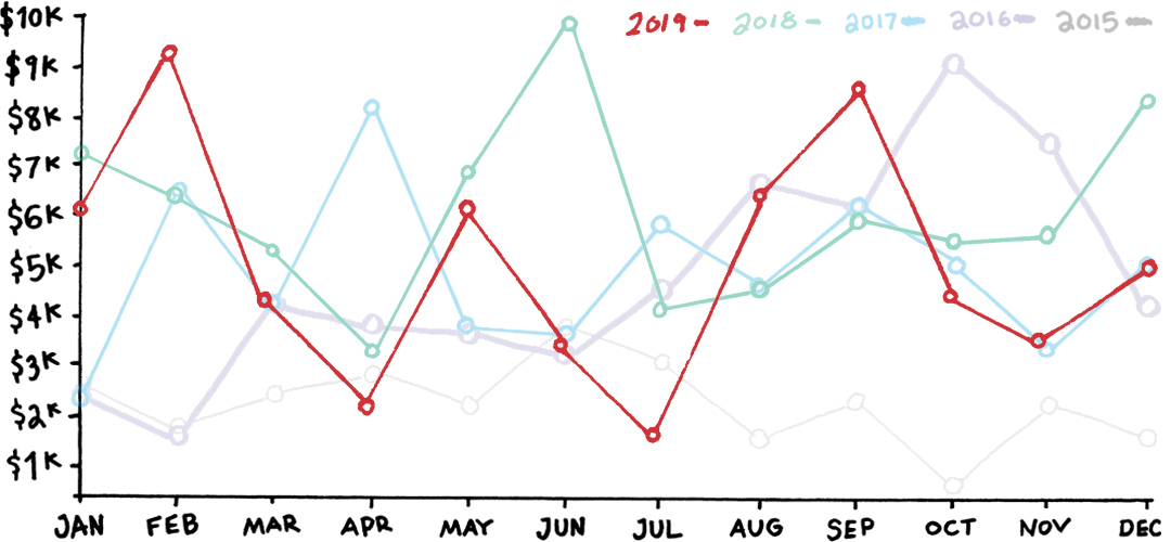 Quick note: these numbers/graphs represented are gross revenue, meaning before fees, taxes, or expenses.